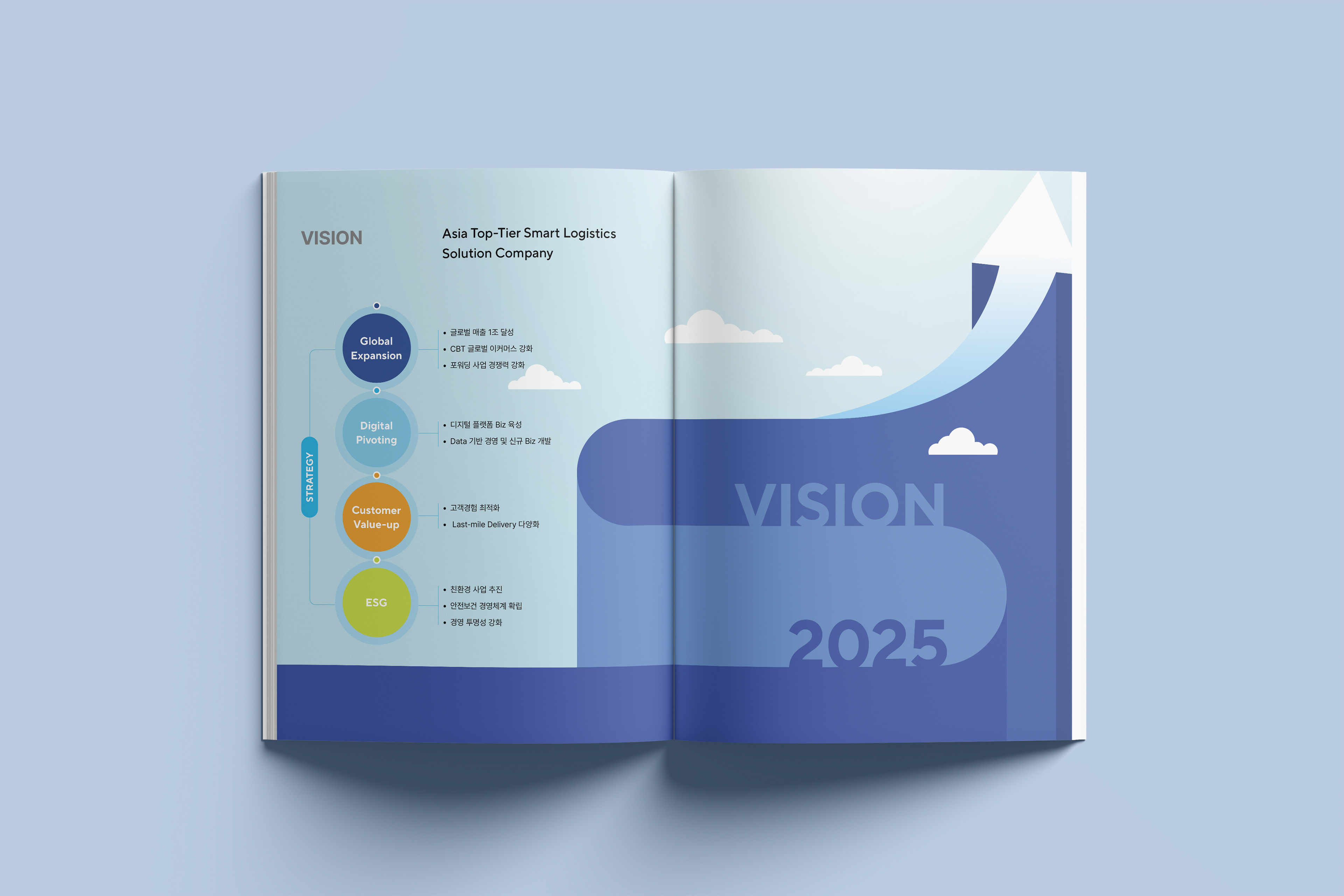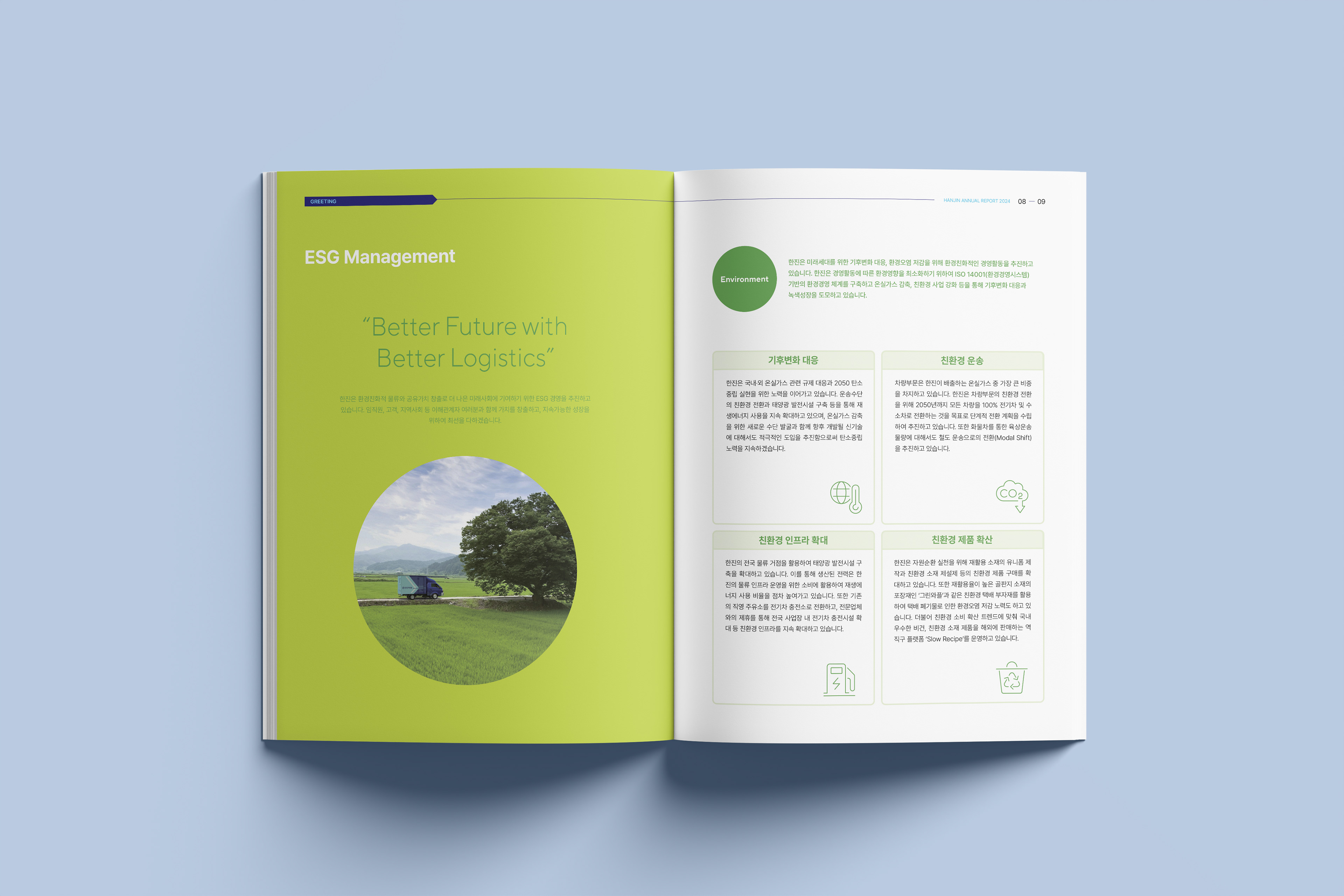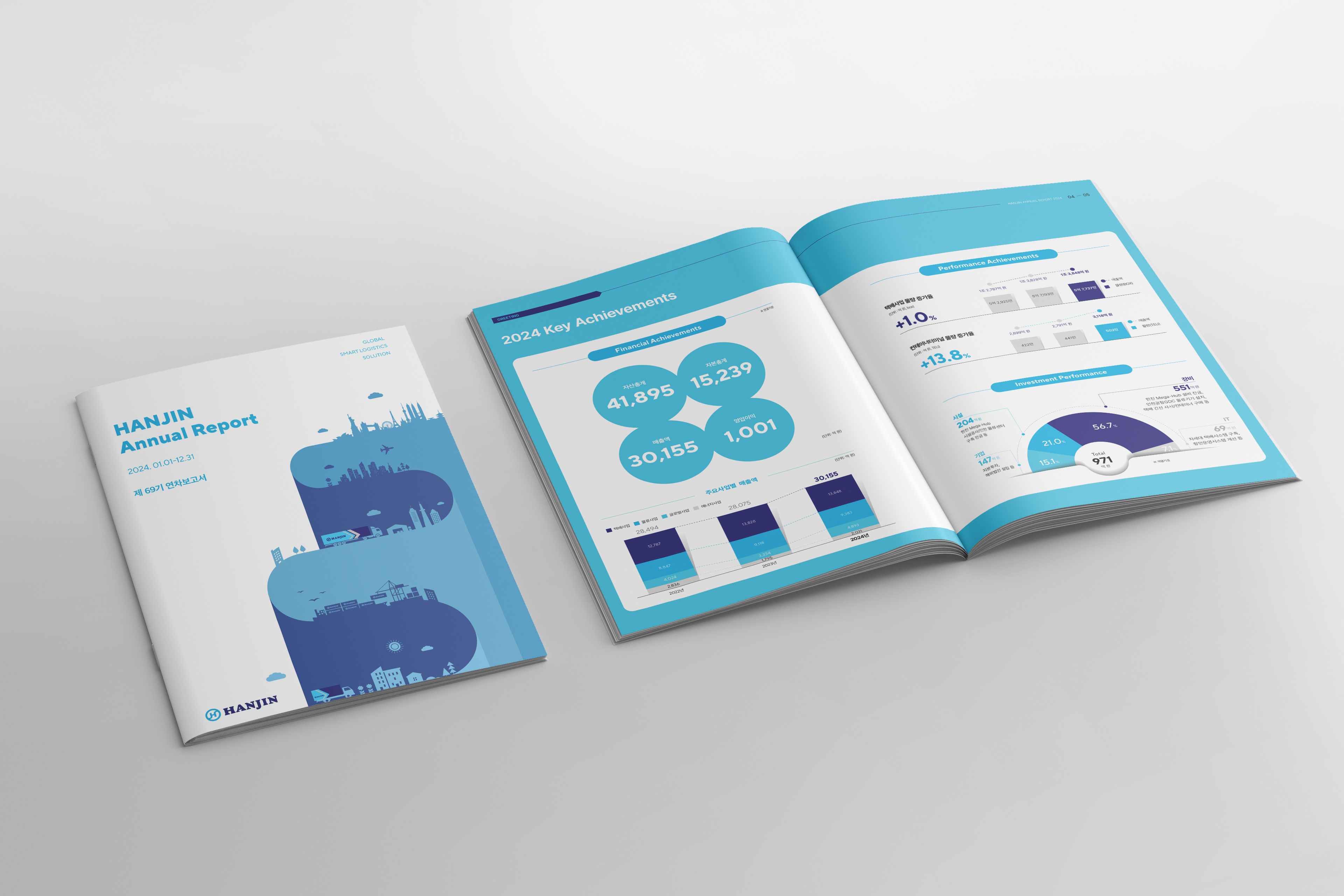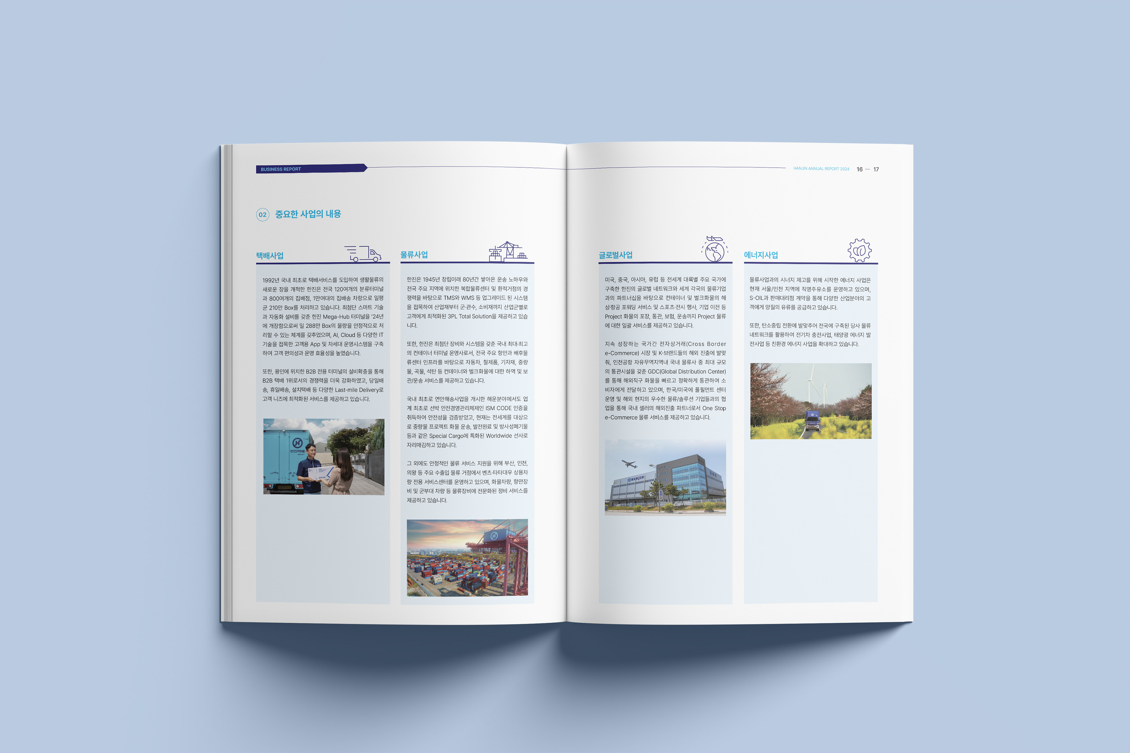 한진은 1945년 창립 이후 수송보국의 철학으로 끊임없이 물류의 길을 개척해온 종합 물류기업입니다. 디자인알피그는 물류산업의 특성을 살려 다양한 사회적 가치를 창출하며 성장하는 한진의 영업보고서를 디자인 제작하였습니다,